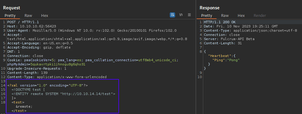Hemos identificado la presencia de la API ‘Fulcrum-API Beta’, la cual opera en el puerto 56423 y responde con datos encapsulados en formato JSON. No obstante, hemos observado que esta API también admite la interpretación de datos en formato XML, lo que nos habilita para ejecutar comandos de entidad externa XML