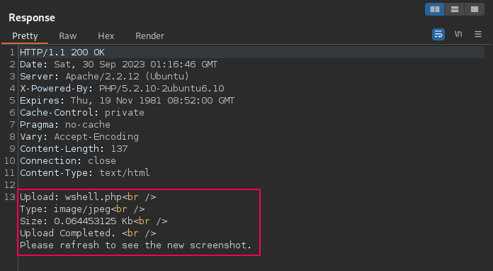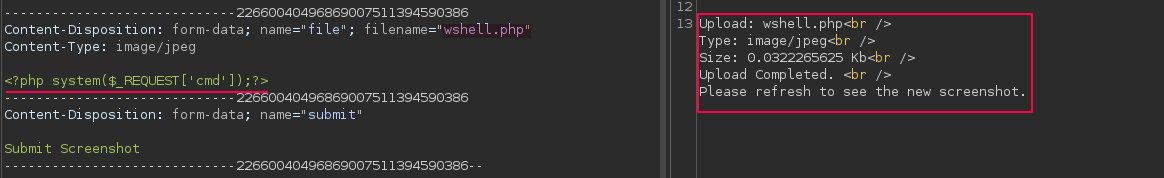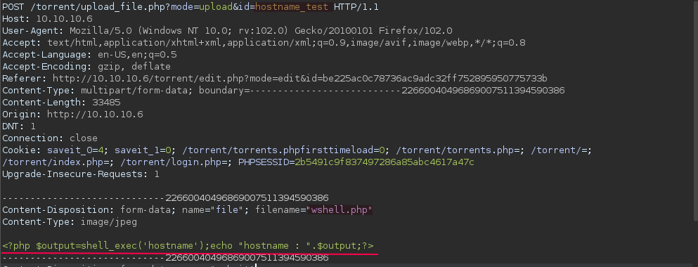 Luego de capturar la petición POST de la carga de la imagen con Burpsuite, puedo modificar el contenido de bytes de la imagen con código php y cambiar la extensión del archivo a php, para intentar ejecutar código en el server, también cambiaré el nombre del id para identificar la carga.