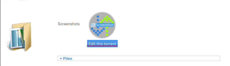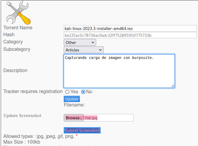 Al revisar el sitio del Torrent Host, podemos cargar un recurso torrent en el apartado ‘upload’. Una vez que nuestro recurso se ha cargado, vemos una funcionalidad de carga de screenshots en la página de edición.